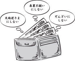 実はこの法則はお金にも通用する話です。私は福沢諭吉さんのお札が大好きで、その能力も十分認めております。したがって、お財布にしまうのも天地逆さまにしたり、表裏不揃いにしまったりするということは許せない。角が折れたままぞんざいにしまい込むなど言語道断です。財布から出して他人様に渡すときは『どうか、また私の所にお戻りください。居心地のよろしいように準備しております』というようにお話をして手放します」