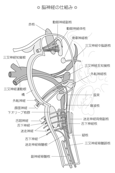 脳からは1本の脊髄という大きな神経が脊柱(背骨)に伸びておりますが、実はほかにも脳自体から脳神経という神経がでております。